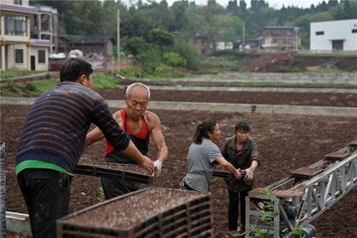 4月9日,内江市东兴区石子镇桂溪社区,“秧保姆”在水稻集中育秧基地劳作。
