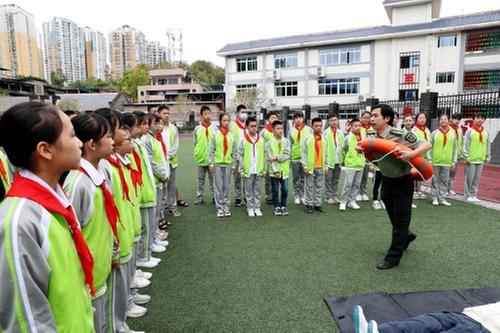 9月1日,广安市广安区北仓路小学校园,广安区浓洄街道人武部部长、办事处副主任龙青辉在给学生上防汛减灾课,讲解救生衣在抗洪抢险中的作用,并指导学生穿救生衣。