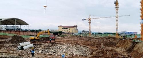 2月12日,项目施工现场,机械轰鸣声不断,挖掘机正挥舞铁臂开挖建设基础、整理地平,工人们忙着砌砖墙、浇注地基等,一派热火朝天的施工景象。