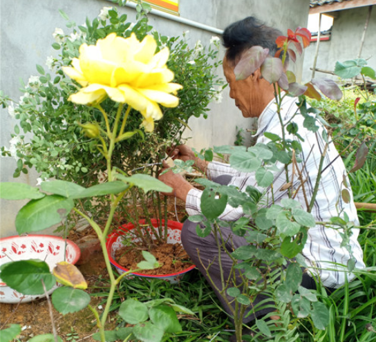 5月14日,眉山市东坡区悦兴镇元宝村乡村振兴政策宣传刚结束,一组84岁的老党员王玉廷回家就扛上锄头,一只手拿着盆子,忙乎在房前屋后种植花卉。