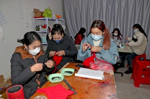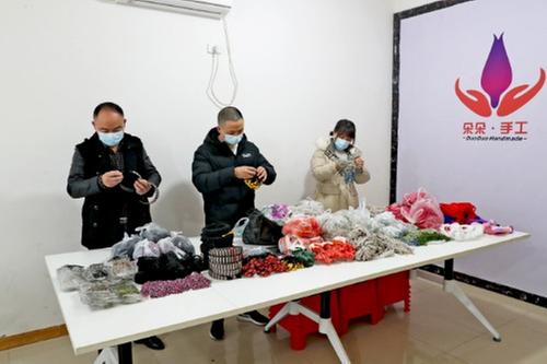 12月12日,广安市广安区北辰街道的家庭妇女们在朵朵手工门店制作纯手工艺品,产品将通过浙江省义乌市销往国外。