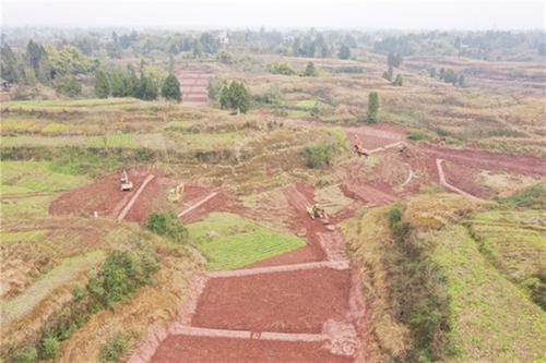 在广安区恒升镇茶坪村高标准农田施工现场,5台挖掘机分布在田间,正在进行田块平整、挖沟渠等作业