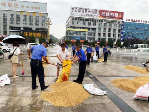 今年8月,岳池县综合行政执法局执法队员日常巡逻至翔凤大道亿联广场时,受理群众寻求帮助。原来,老人看着天气不错,将刚收割的稻谷铺到广场晾晒,谁知天公不作美下起大雨来,老人的儿子在将稻谷用货车拉过来后就去拉货了,一时半会儿回不来,看着满地的稻谷,再看看老人的脸,已分不清是急出来的汗水还是雨水,执法队员向上级及时汇报该情况。几分钟后,执法队十余名队员携带工具来到现场,迅速帮助老人抢收稻谷,不到一小时,约两千斤稻谷全部装袋完成,并主动提出帮老人们将稻谷运送回家。