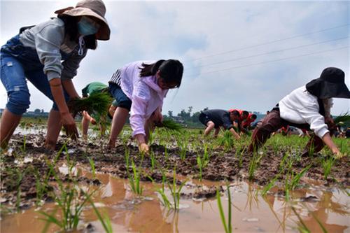 “巾帼不让须眉”助耕队伍中的女同志,个个顶呱呱。女党员芬栽得又快又好,她栽完后刚上田坎就被大家竖起大拇指点赞。她说:“过去我是农民,小的时候就学会了栽秧,小意思。”芳就不一样,运气不好的她,走到了一厢泥脚比较深的地方,别说栽秧,光是在田间行走都极为不便。原来,这块田过去栽的果树,果树与果树之间有一条很深的沟,虽然用机器把田耙平了,但原来是沟的地方泥土是松软的,一脚下去就陷得特别深,少则五、六十厘米,多的达八十厘米以上!还有拳头大小的石块在稀泥之中,把脚刺得钻心的痛。“谁知盘中餐,粒粒皆辛苦!”芳说,回去之后,一定要告诉儿子,要从小养成节约粮食的好习惯,粮食真的来之不易啊!