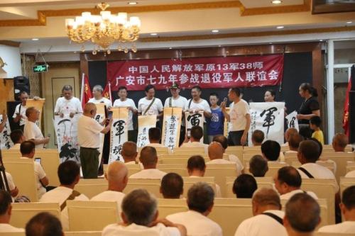 为庆祝“八一”建军节,弘扬伟大建军精神,7月30日,在广安区退役军人事务局的指导下,中国人民解放军原13军38师广安市七九年部分参战退役军人在做好疫情防控的前提下汇聚一堂,举行联谊会,通过一起重温军人誓词、合唱嘹亮军歌、回顾对越自卫反击战点滴、诗歌朗诵、有奖建军知识问答、赠送建军书法作品等方式展示退役军人风采,不忘保家卫国的初心,并宣誓承诺:虽然退役,但是只要祖国召唤,照样披挂出征、所向无敌,誓死保卫祖国。