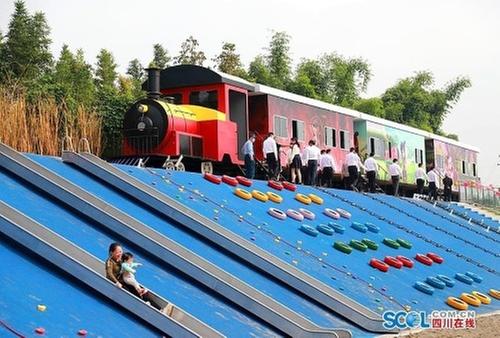 夹江县成昆铁路遗址公园利用原成昆铁路废弃铁路轨道,实施景观护坡、道路铺装、绿化及相关配套工程,建成了儿童游乐区及怀旧文创区。其中,火车头内部的老照片,生动展示了夹江县护桥女子民兵连的形象。火车车厢还将引进轻食、冷饮等业态,为游客市民提供一个独特的休闲场所。