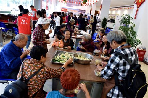 随后,社区志愿者们与老人们一起包饺子,拌馅、和面、擀皮……大家有说有笑,边包饺子边拉家常,其乐融融。不一会儿,热腾腾的饺子出锅了,老人们开心地品尝着一个个香喷喷的饺子,脸上洋溢着幸福满足的笑容,现场充满着节日的气氛。