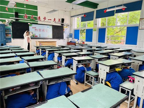 第一次警报响30秒,处于底楼学生立即双手护头或用课本压住头顶,在副班主任的带领下有序疏散,班主任在全班最后,督促每个学生离开;楼上学生双手护头躲到桌子下,准备疏散。第二次警报响起,楼上学生双手护头有序撤离。楼道口的安全护导老师待学生全部撤离后,就随队伍到操场指定地点组织学生。听到疏散号令后,所有师生迅速有序从规定路线跑到学校操场,用时4分9秒,整个疏散过程文明有序、安静迅速。疏散结束,刘校长对此次应急疏散活动进行总结,对大家的表现给予肯定。