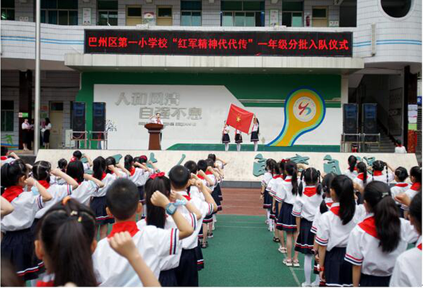 6月8日,巴中市巴州区第一小学举行了“红军精神代代传”一年级新生入队仪式,300名一年级学生光荣地加入了中国少年先锋队。
