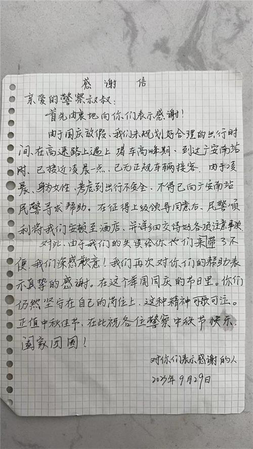 写信人是两位刚刚离开家乡、离开父母,某师范院校幼师专业的大一新生。这是她们上大学后的第一个黄金长假,是她们成年后第一个带着思念奔赴父母怀抱奔向团员的日子。9月28日,两个小姑娘激动的心情逐渐被高速路上长长的车龙消磨,眼看天色已经暗下来,车队却越来越长,行进依然十分缓慢,当她俩到达广安汽车站时,已是凌晨12点过了。俩小姑娘一个家在华蓥市乡村,一个要回前锋区镇上,距离车站都还有五六十公里路……站在凌晨的路灯下,俩姑娘傻眼了,既舍不得租车回去,又不知道怎么落脚。一翻商量后,俩人一致决定到亮着灯的经开公安特巡警值班室坐一宿。