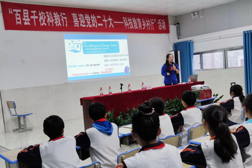 活动邀请到了成都师范学院教授夏珊作了题为“癌细胞的自述”的科普讲座。讲座从癌细胞的形成、癌细胞的危害、科学预防癌症等方面入手,教育引导青少年学生从小注重习惯养成培养,养成健康、向上的生活、学习习惯。号召、鼓励同学们多运动,多锻炼,保持健康体魄,养成定时体检的好习惯,努力学习,长大后为祖国强大、人类社会发展添砖加瓦、贡献力量。