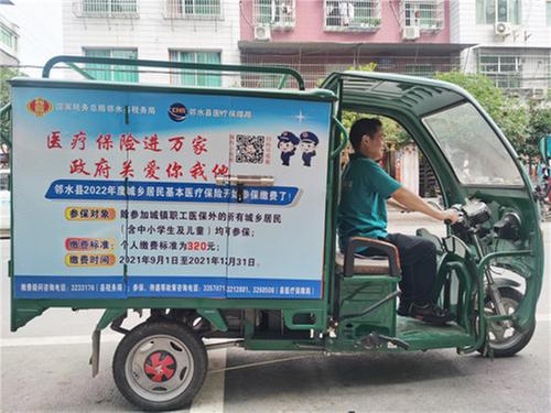 一是通过线上大力推进宣传。制作宣传小视频,利用“广安税务”微信朋友圈进行广告推广,同时利用微信群、朋友圈转发等进行全方位跟进,扩大线上宣传广度。二是小区楼宇电梯广告宣传。在全县66个小区的电梯投放宣传广告,以小视频方式简明扼要告知群众缴费时间、标准、途径及咨询电话等重要信息,以便居民及时了解参保缴费情况。三是利用邮政投递车辆车身广告宣传。对全县18辆乡镇投递车辆量身定制宣传广告,充分发挥流动车辆的作用,流动性的同时又带来重复性,受众面积大,受众群体广,打通乡镇宣传“最后一公里”。四是随报刊入户投送明白纸。制作《邻水县2022年度城乡居民医保参保缴费政策明白纸》,随同邮政送报纸一并投送到村社,邮政快递员在派发邮件的同时将《明白纸》进行入户投送,争取做到家喻户晓。