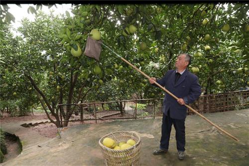 11月2日,在广安市广安区龙安柚现代农业园区龙安乡群策村龙安柚种植基地,种植大户唐华正在喜滋滋地查看已经被订购的龙安柚长势,金色果实收获“金色财富”。