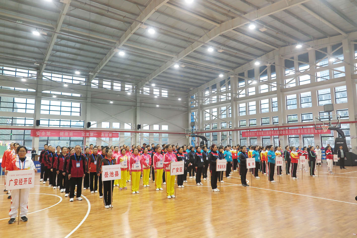 10月25日,广安市武胜中学全民健身中心周围悬挂着“安全第一、健康第一、交流第一、友谊第一”“热烈欢迎各县市区(园区)代表队来我县参赛”“热烈祝贺广安市第三届老年人运动会柔力球比赛在我县隆重举行”的三幅标语,原来,这是广安市第三届老年人运动会柔力球比赛开赛仪式在武胜中学全民健身中心举行。