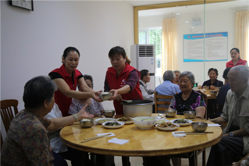 9月9日16:50,青神县凤阳社区老年人日间照料中心,老人们在志愿者的陪伴下开心用餐