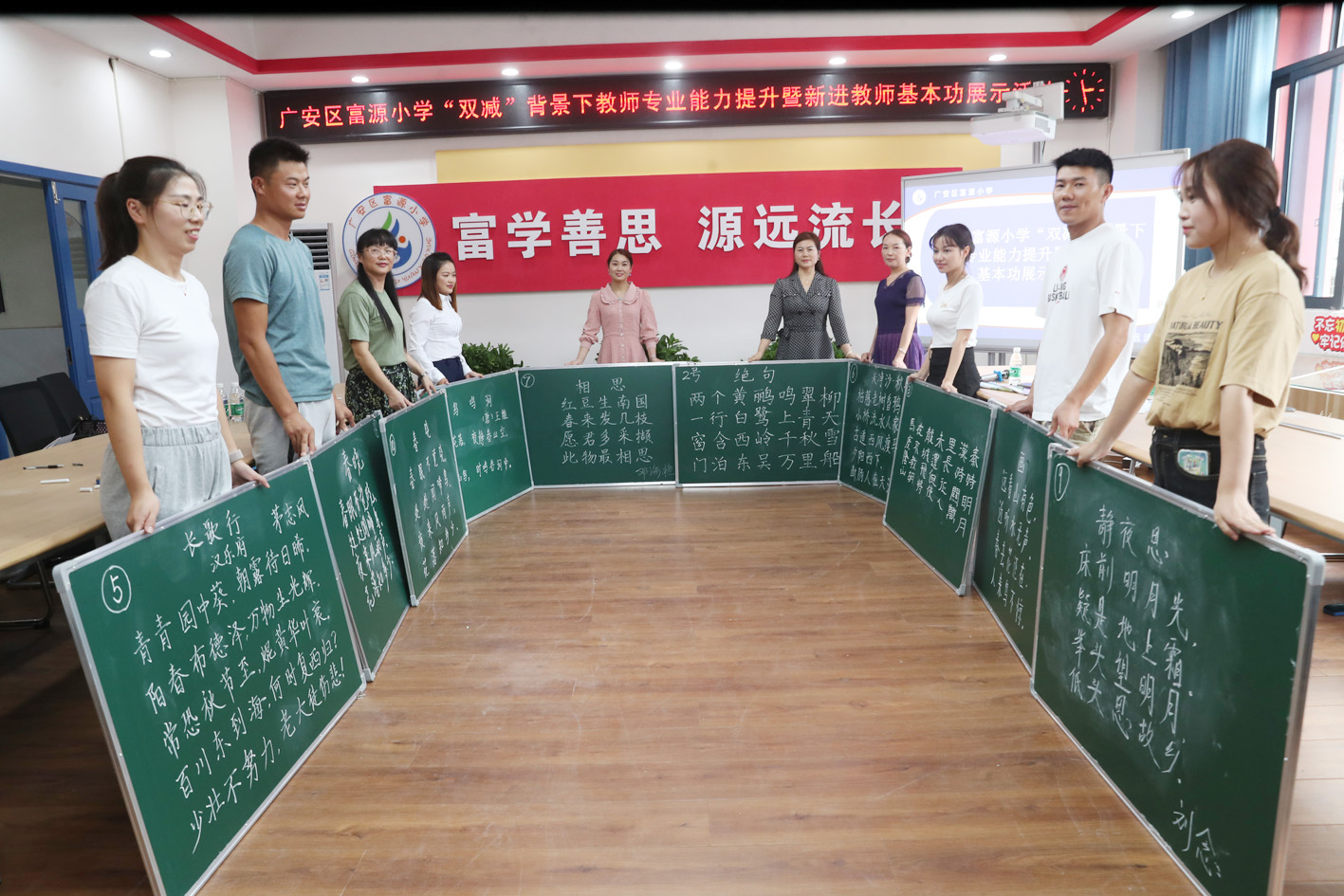 近日,广安市广安区富源小学的党建活动室内,该校新进教师正在集中展示自己的粉笔字书写,以扎实基本功迎接“双减”挑战。