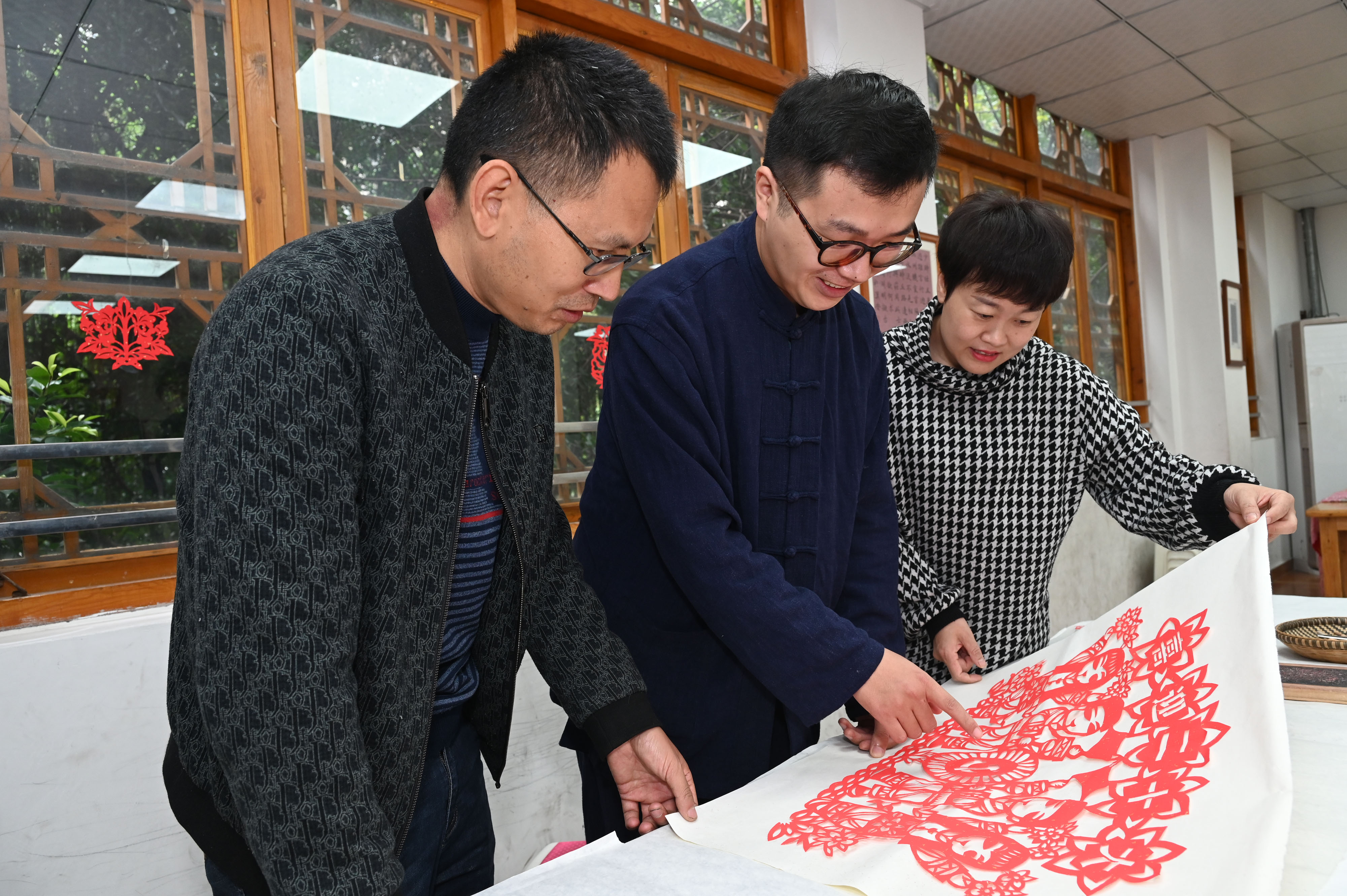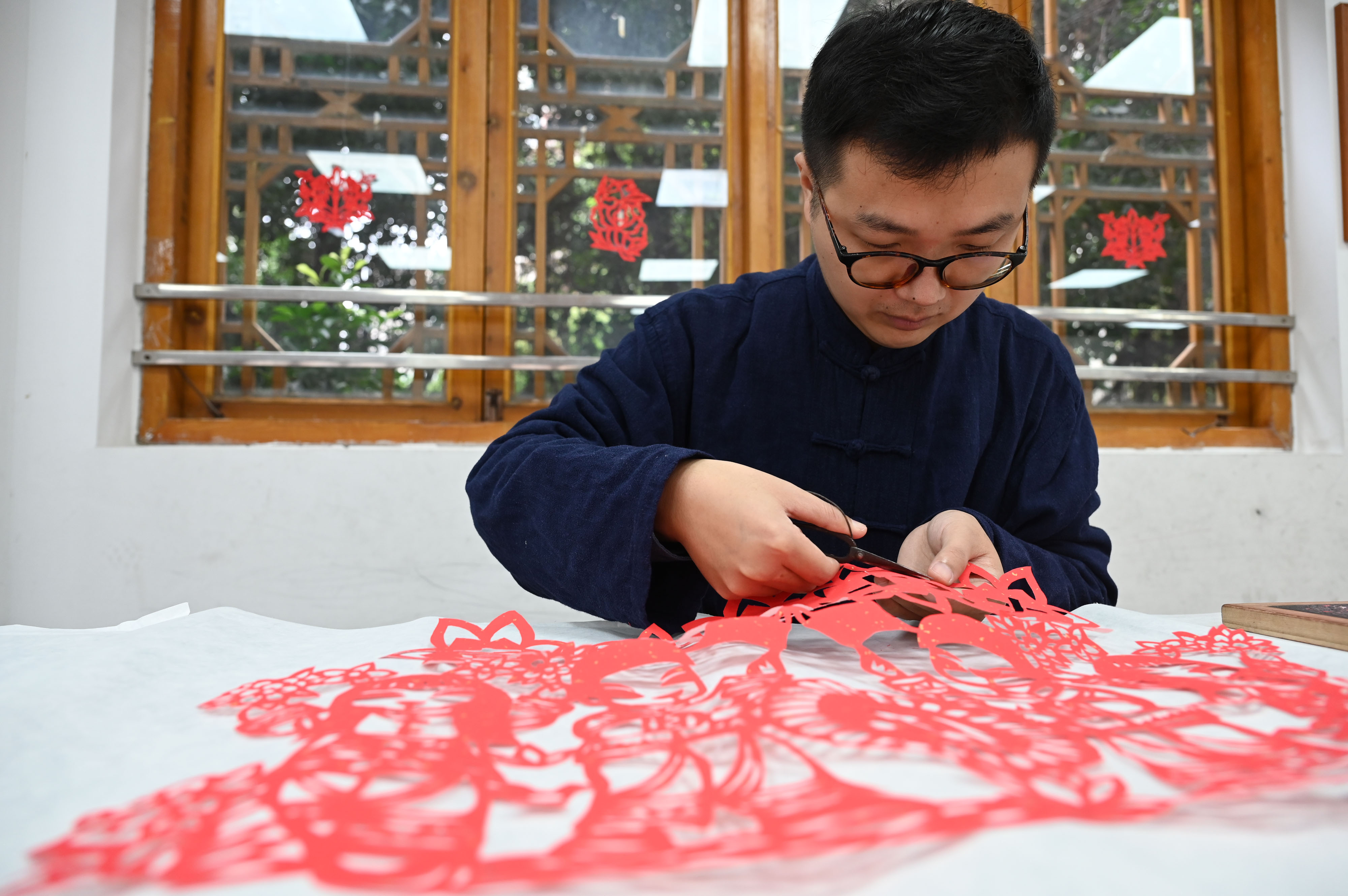 10月11日,在内江市东兴老街新时代文明实践站,民间剪纸艺人李有生正在介绍他创作的“喜迎二十大 永远跟党走”剪纸作品。
