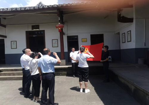 随后,全体党员在周永开旧居,面对鲜红的党旗,在领誓人的带领下举起右手,庄严地向党旗宣誓,重温入党誓词,使每一位党员接受心灵洗礼、激发党性热情。