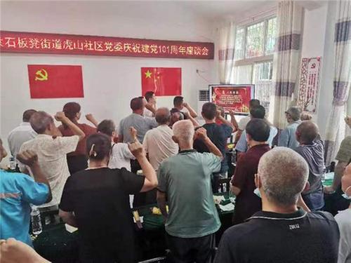 活动中,虎山社区党委书记鄢家兴带领大家重温入党誓词,让党员回想入党之初对党和人民的庄严承诺,牢记为人民服务的使命,激励党员群众立足本职岗位创先争优,以良好的工作业绩向党的生日献礼。