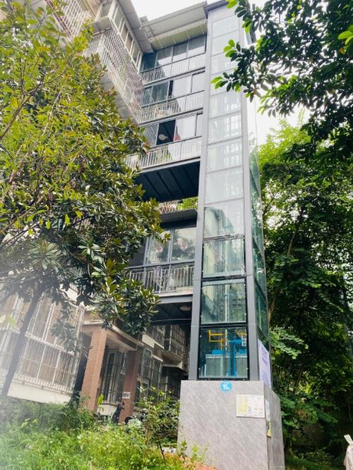 走进简阳河东花园A区,一部部电梯矗立在单元楼外,透过玻璃外墙还能清楚地看到内部轿厢,安稳地运送着上上下下的居民。
