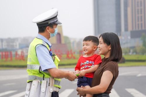 9月10日,广安华蓥市交警大队民警张永春正在高速卡点值班,他的妻子带着儿子,为他送上团圆月饼,寓意共度中秋佳节。