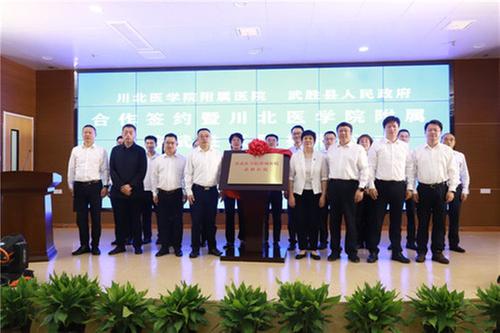 武胜县县委书记谭云和川北医学院附属医院党委书记胡春梅共同为川北医学院附属医院武胜医院揭牌;武胜县县委副书记、县长陈俊楠和川北医学院附属医院院长谢建平分别致辞;武胜县县委常委、宣传部部长胡斌韬主持仪式;武胜县县委组织部、县财政局、县发展改革局、县卫生健康局、县医疗保障局等相关负责人以及川北医学院附属医院和武胜县人民医院相关同志参加签约仪式。