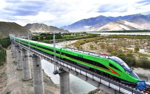 2021年6月25日,全长435公里、设计时速160公里的拉林铁路建成通车,西藏首条电气化铁路建成,同时复兴号实现对31个省区市全覆盖。这是试运行的复兴号列车行驶在西藏山南市境内(2021年6月16日摄)。新华社记者 觉果 摄