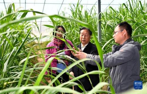 菌草专家林占熺(中)在宁夏银川市永宁县闽宁镇农户刘昌富的大棚里查看菌草生长情况(2021年3月29日摄)。新华社记者 王鹏 摄