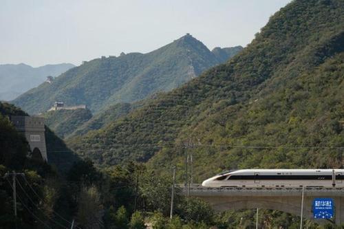 一列复兴号高铁列车从京张高铁驶过居庸关长城(2020年10月6日摄)。新华社记者 鞠焕宗 摄