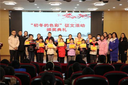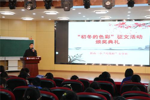 2021年12月29日,彭山区第一小学“巧笔杆”文学社“初冬的色彩”征文活动颁奖典礼在学校演播大厅举行。彭山一小副校长盛宇翔、教科室主任梁巨中、“巧笔杆”文学社的六位辅导员老师以及文学社全体成员参加了典礼。