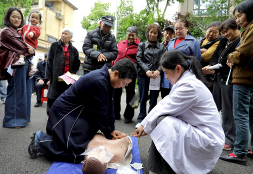 图为:医务人员指导居民学习心肺复苏急救知识。
