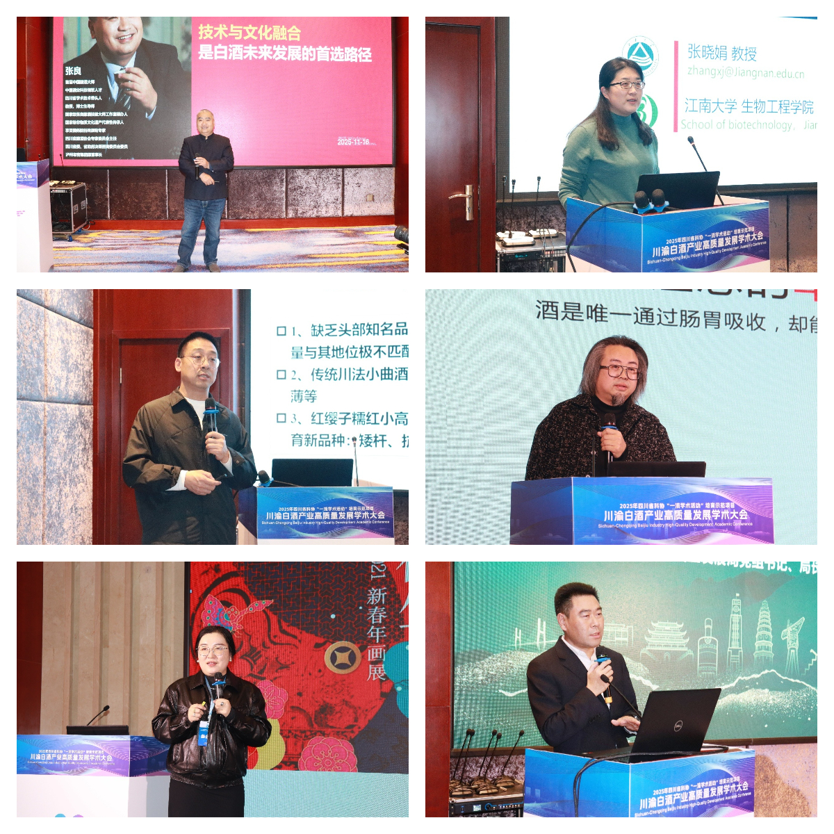 主旨报告环节,四川中国白酒金三角酒业协会副理事长、秘书长陈大智以“‘科艺赋能、守正创新’培育新质生产力,推动川渝白酒产业高质量发展”为题,从“科技赋能:智能酿造重塑川渝酒业竞争力”“艺术赋能:文化表达与设计创新的融合革命”等6个方面,系统阐述了川渝白酒产业培育新质生产力、实现高质量发展的路径与思考。四川大学先进酿造科技创新中心主任、国家固态酿造工程技术研究中心副主任许正宏以“白酒产业的新挑战、新动能、新路径:调整周期中白酒产业困境与川渝创新突围”为主题作了报告,剖析了行业面临的共性难题与发展机遇,提出通过科技与艺术的双重赋能,为产业转型升级提供创新思路。四川大学艺术学院教授、中国包装联合会设计委员会副主任陈小林在题为“中国白酒品牌IP形象塑造与包装设计”的报告中指出,包装设计应深度融合文化元素,将传统文化精髓与现代审美趋势巧妙融合,讲述品牌故事及传递文化价值。四川大学食品与微生物国际联合研究中心主任、四川大学锦江学院白酒学院院长张文学以“科艺赋能产业融合,激活白酒市场‘三新消费’”为题,分析了白酒酿造中科技与艺术的融合实践,重点探讨了科艺融合如何通过拓展新消费人群、创造新消费场景与新消费用途,促进白酒全产业链贯通。