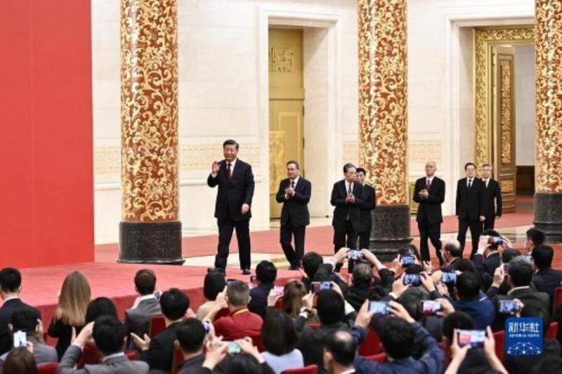 新华社北京10月23日电 刚刚在中国共产党第二十届中央委员会第一次全体会议上当选的中共中央总书记习近平和中共中央政治局常委李强、赵乐际、王沪宁、蔡奇、丁薛祥、李希,23日中午在人民大会堂同采访中共二十大的中外记者亲切见面。