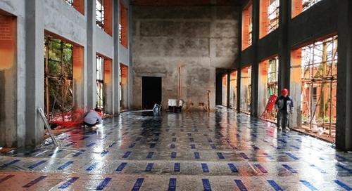 记者看到,“两山”转化基地改扩建项目各楼栋主体施工已完成。室外,工人正在进行檐板施工、防水施工、箱涵防洪沟施工等;室内,工人正在进行各功能房排污设施施工、空调管安装、地暖施工等。