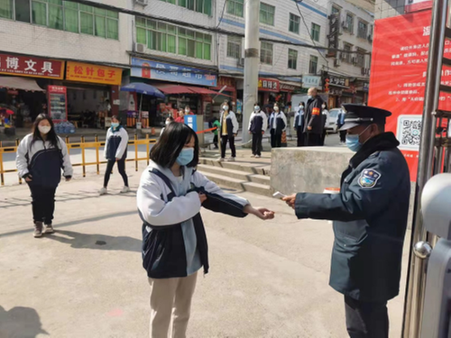 学生入校进行演练时,必须戴好口罩,手持健康卡,保持一米左右间距,分两条通道有序接受体温监测后方可进入学校。如有学生体温超过37.3度,学校会立即启动疫情防控紧急预案,将体温异常学生带至校外隔离区,身着防护服的校医再次用水银温度计对学生进行体温检测,体温仍然异常,当即联系学生家长将其送往医院就诊。