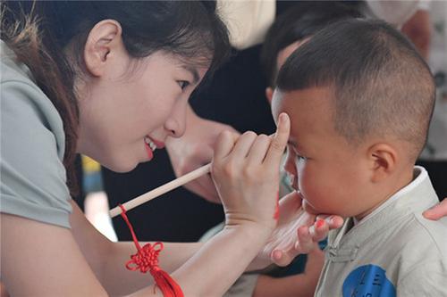 南充市蓬安县城东幼儿园老师正在为入园新生点“朱砂启智”。彭圣洲 摄。