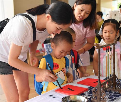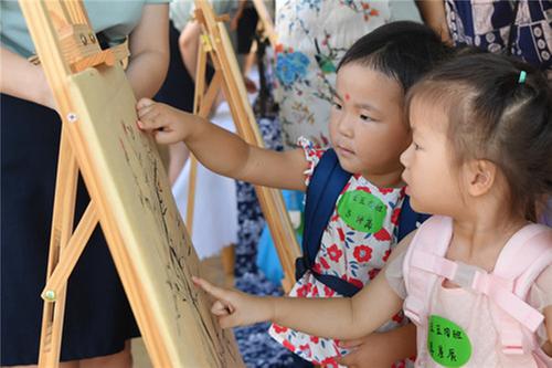 在南充市蓬安县城东幼儿园,新入园的孩子们正在“开笔破蒙”。彭圣洲 摄。