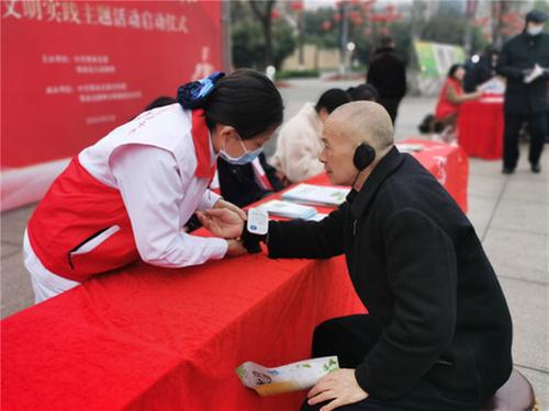 此外,邻水县文化馆工作人员通过三句半的形式对习近平总书记来川视察重要指示精神进行了宣讲。启动仪式结束后,现场志愿者们还向邻州广场的群众分发宣传材料,讲解各类惠民政策,普及文明行为规范、生态环保、法律援助、应急救援等各方面的知识,并为群众带去了免费身体健康检查、理发等暖心服务。