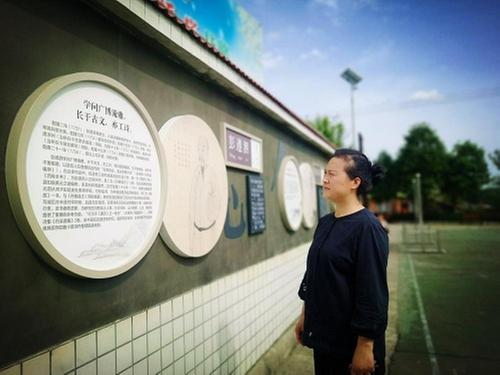 村民罗贵丽正在观看村内打造的廉洁文化墙