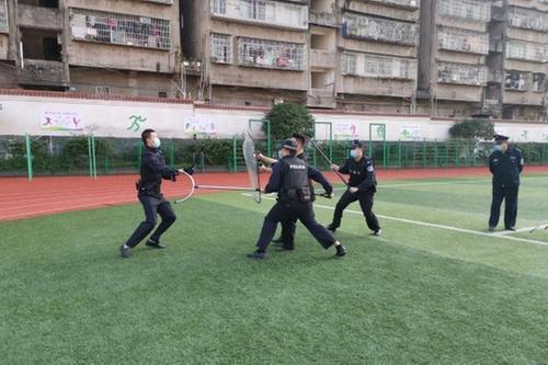 应急演练现场,一名“歹徒”手持甩棍,欲闯入校内行凶,值班保安发现情况立即拉响警铃,启动反恐防暴应急预案,保安人员迅速到位,手持钢叉、盾牌与“歹徒”周旋,伺机将“歹徒”制服。