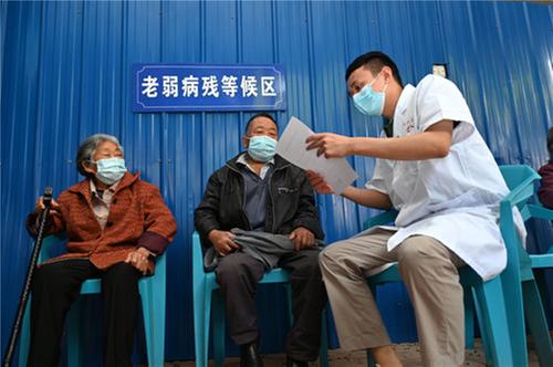 4月27日,在内江市东兴区高梁中心卫生院新冠疫苗接种点,医护人员有序为当地群众接种“加强针”。