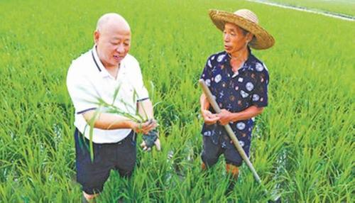 高德敏(左)和村民讨论水稻长势 郫都区委宣传部供图