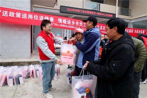活动现场,各方单位为返乡农民工宣传人社和农民工服务保障政策,推介就近就业岗位,为农民工进行流行感冒、慢病防治知识普及及义诊。此外,还现场向农民工释疑解惑,并赠送包含人社政策、招聘信息、茶杯、雨伞、毛巾等实用物资的大礼包,让他们感受家乡的温暖。