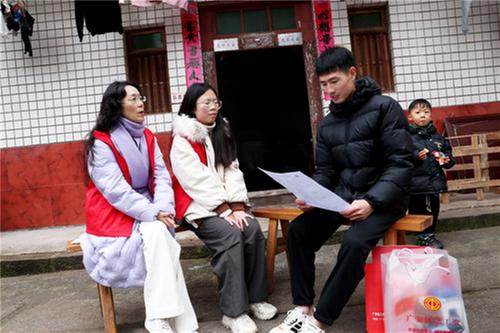 1月31日,在广安市广安区悦来镇高兴村党群服务中心门口,广安市人社局联合党支部党员志愿者在向返乡农民工宣传人社政策。