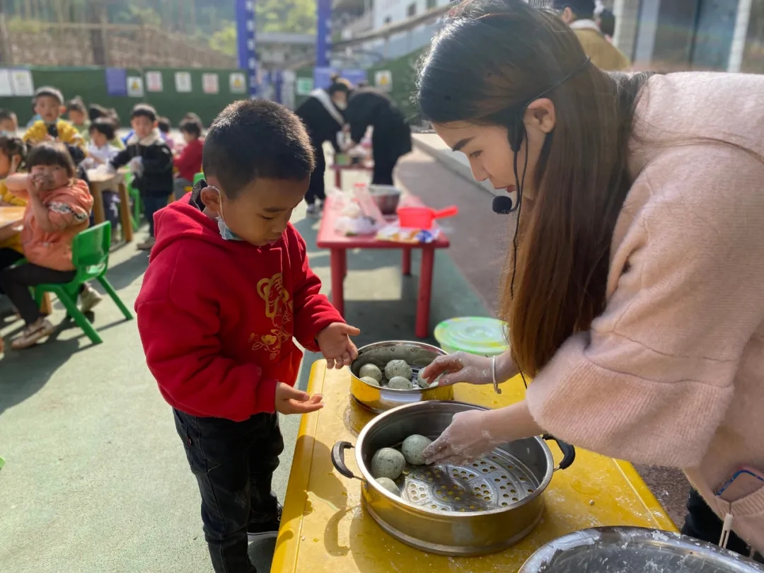 小班组幼儿用稚嫩的童声唱起《清明》古诗歌谣,配以动作表演,赢得观众的阵阵掌声;中班组通过清明手指谣、识花茶、品花茶等活动忆清明;大班的孩子们和老师一起动手制作青团,将面皮揉好后,包上甜甜的豆沙馅,再轻轻揉圆,放入盘中蒸熟后共同品尝,活动让他们了解到青团的原料包括糯米粉、粘米粉、豆沙等不同食材。