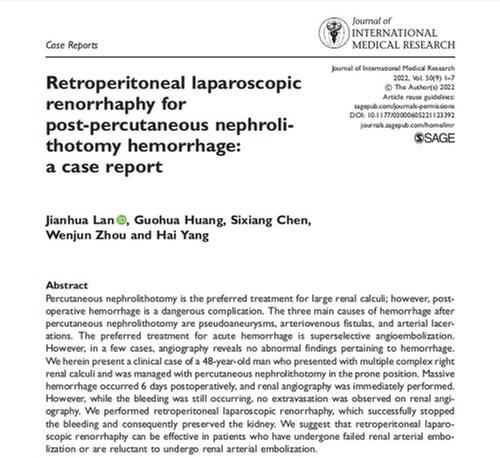 蓝建华团队经过查阅相关文献,针对介入找不到出血点仍反复出血的患者采用后腹腔镜下肾动脉无阻断肾修补术,最大限度地为患者保留肾功能,为该类手术并发症提供了新的解决思路。目前,该文章已发表在《Journal of International Medical research》。据悉,该方法系国内外首次报道。