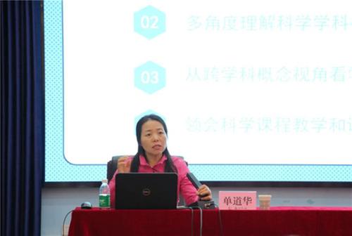活动中,江苏省特级教师、苏教版科学教材编写组成员、南京市教学研究室评价教研员单道华老师作了题为“多角度理解2022版义务教育科学课程”的专题讲座。她从“初步了解课程结构”“多角度理解科学学科核心概念”“从跨学科概念视角看学科世界观”“领会科学课程教学和评价建议”等四方面进行了详细阐述。其间,还对13个学科核心概念的内涵、外延与结构进行了细致的分析。