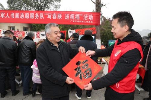 随着春节临近,各地开展各式各样的写春联送祝福活动,营造喜庆的节日氛围。当日,广安区退役军人事务局组织10名退役军人书画志愿服务队队员到北辰街道人工湖广场,展示书画艺术特长,现场免费市民义务写春联、福字,创作喜庆的剪纸和书画作品,让市民将浓浓的年味带回家。