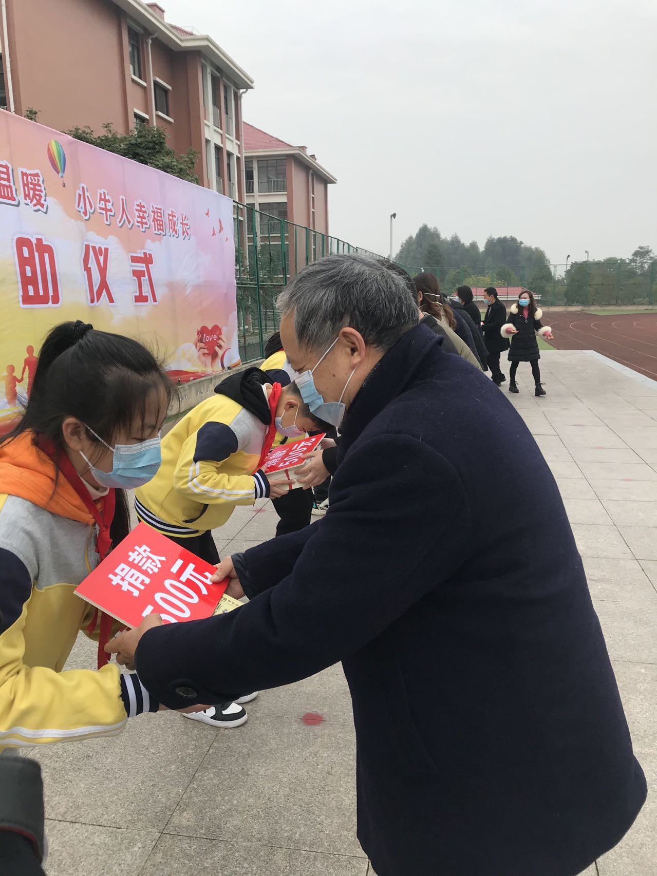 12月12日,眉山市关工委、市关心下一代基金会,东坡区关工委、区教体局,富牛镇共同在富牛小学举行以“老少牵手送温暖、小牛人幸福成长”为主题的捐助活动,当场将爱心企业捐赠10万元助学金,分别发送至117名品学兼优学生、家庭困难学生、留守儿童手中,让孩子们在冬天里感受到浓浓的暖意。