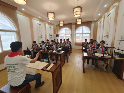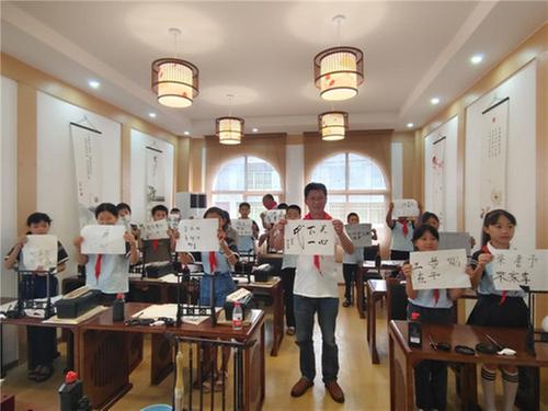 夏老师教得仔细,孩子们学得认真,在宣纸上一笔一划写下了自己的名字。现场飘着淡淡的墨香,孩子们沉浸在书法世界中,国学课堂上充满着浓浓的书卷气。